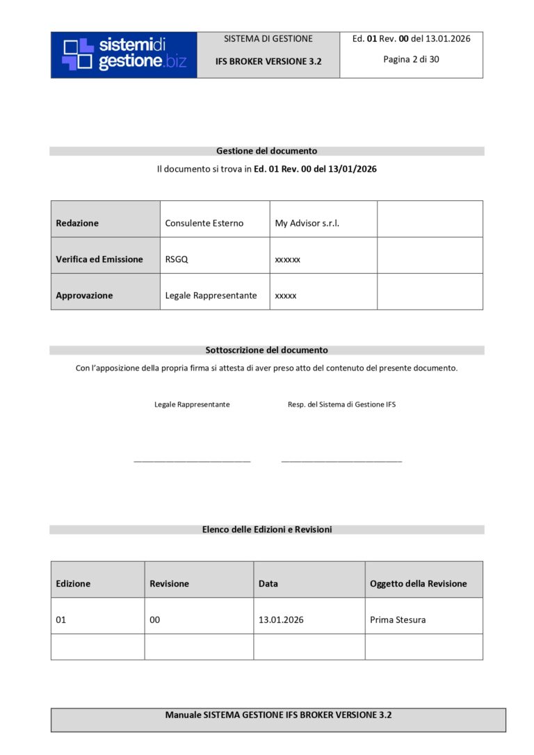 Il Kit Documentale Sistema di Gestione IFS Broker è CONFORME alla versione IFS Broker v.3.2 ed è sviluppato in LINGUA ITALIANA.
