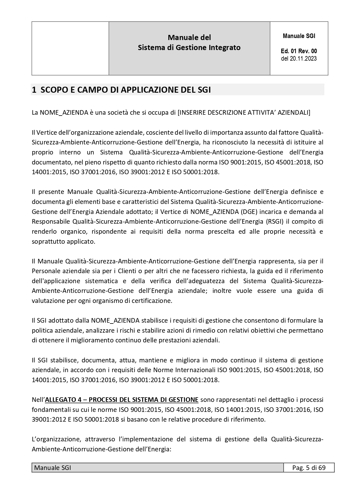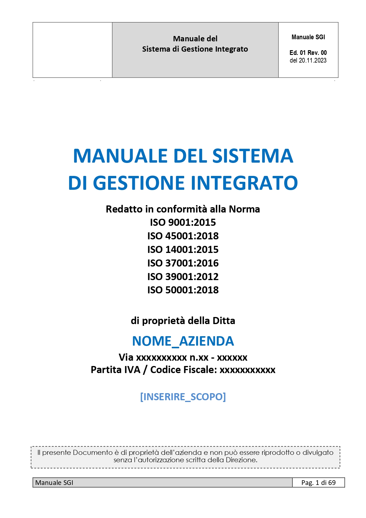 Kit Documentale Sistema di Gestione Integrato ISO 9001 – ISO 14001 – ISO 45001 – ISO 37001 – ISO 39001 – ISO 50001