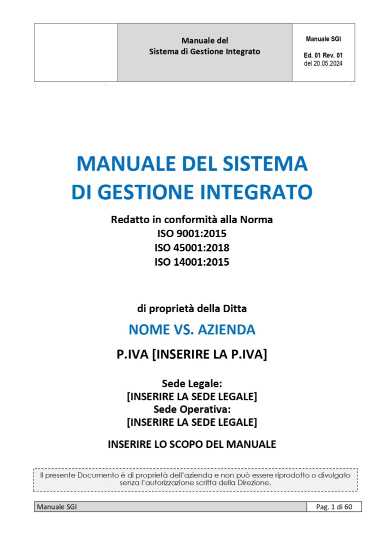 Questo kit ti consente di implementare in modo rapido e strutturato un Sistema di Gestione Integrato ISO 9001 – ISO 14001 – ISO 45001, senza dover creare documenti da zero.