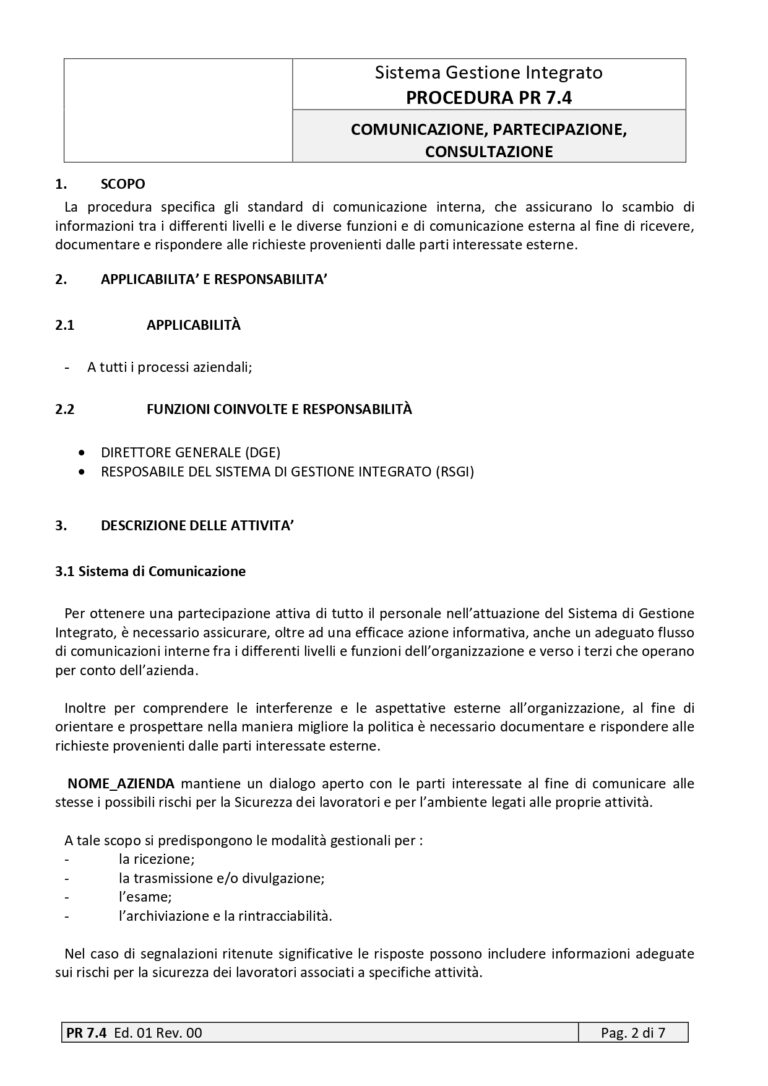 | 8 | PROCEDURA | 7.4 | COMUNICAZIONE , CONSULTAZIONE, PARTECIPAZIONE | |