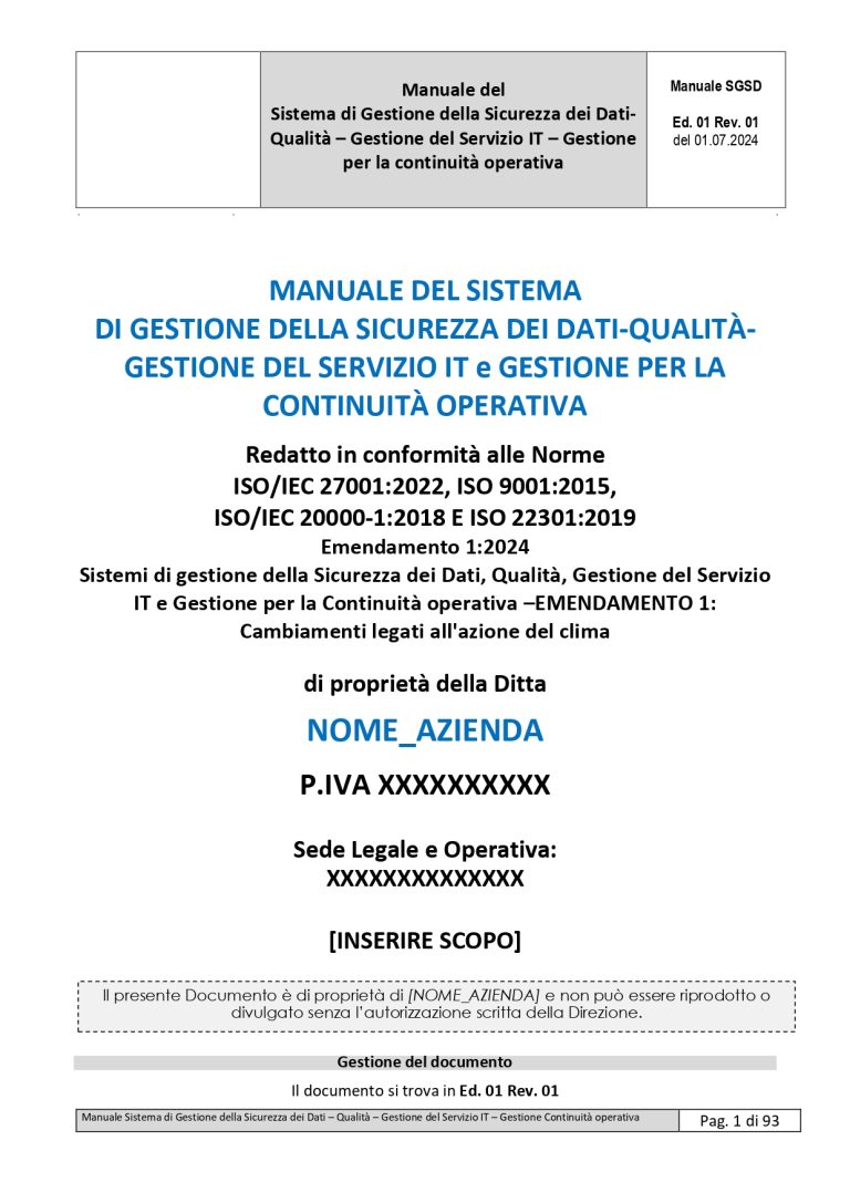 Questo kit ti consente di implementare in modo rapido e strutturato un Sistema di Gestione Integrato ISO 9001 – ISO/IEC 27001 – ISO/IEC 20000-1 – ISO 22301, senza dover creare documenti da zero.
