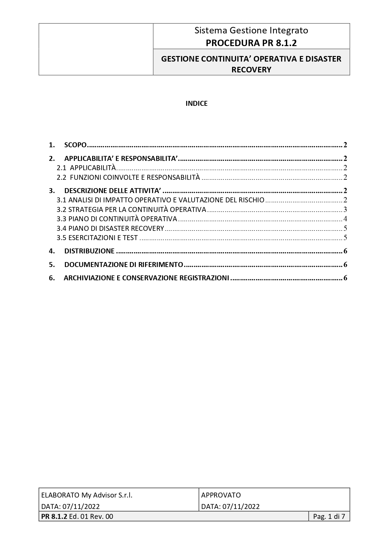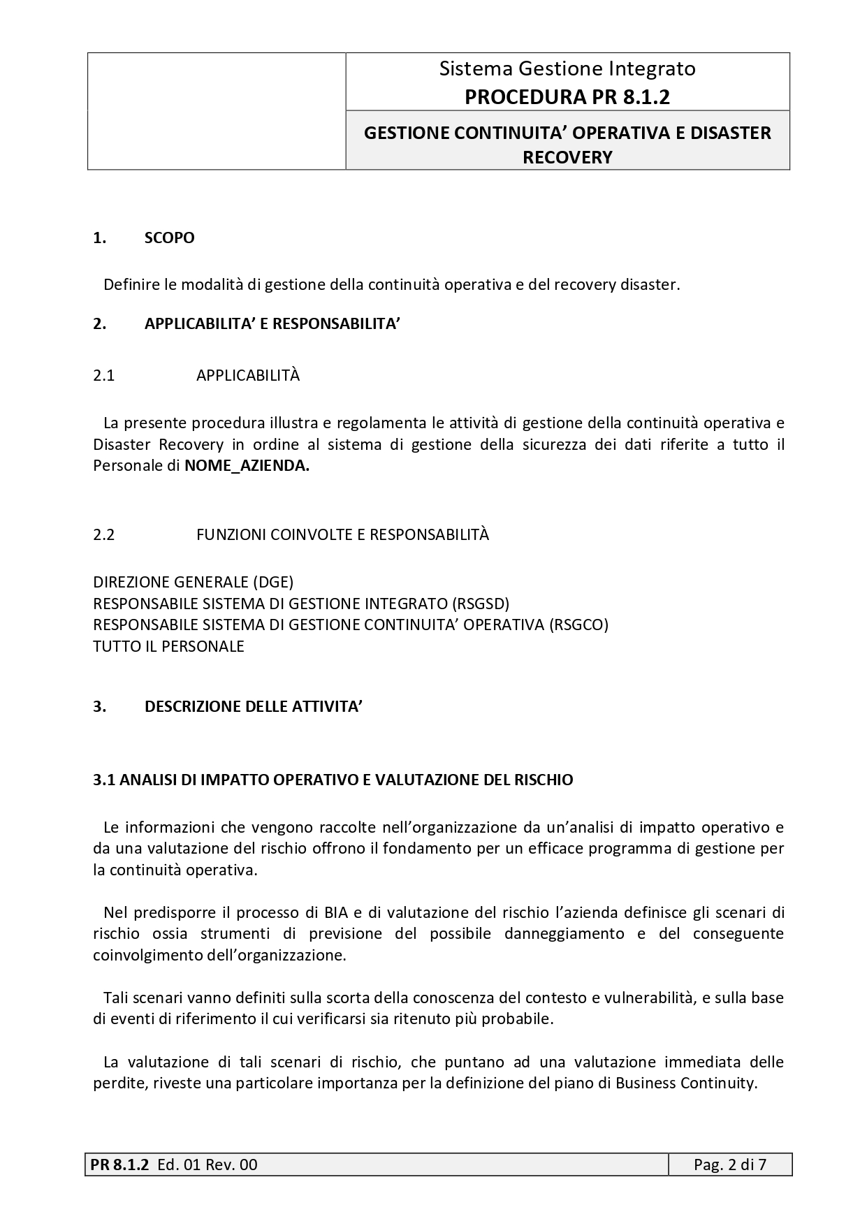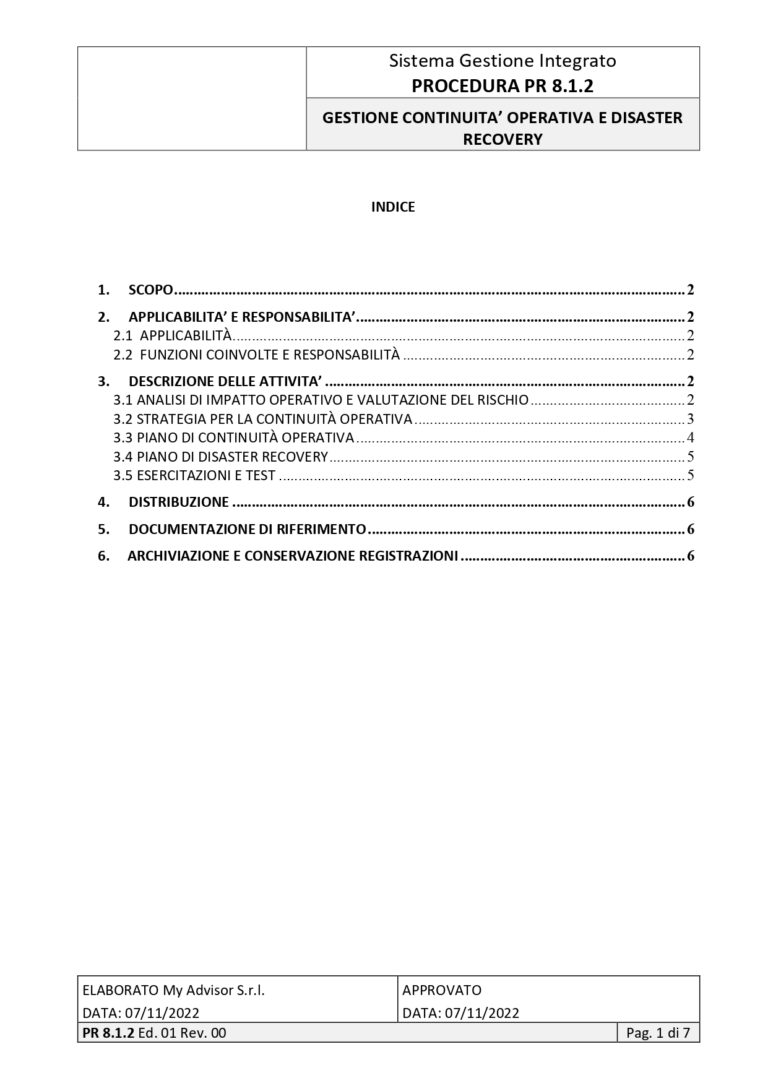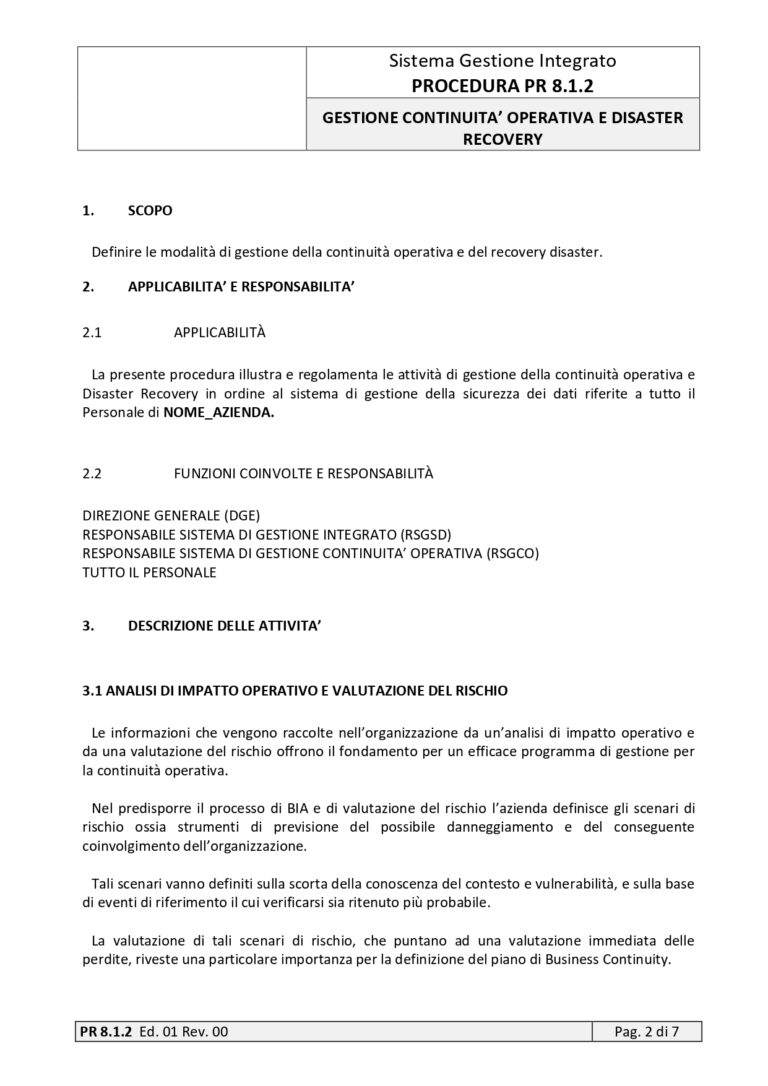 | 11 | PROCEDURA | 8.1.2 | GESTIONE DELLA CONTINUITA’ OPERATIVA E RECOVERY DISASTER | |