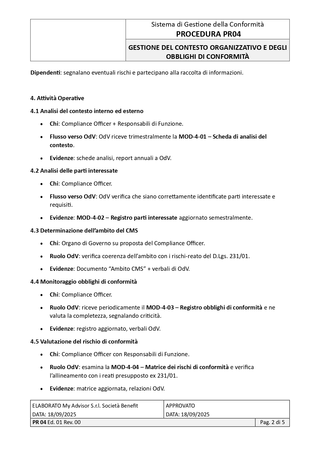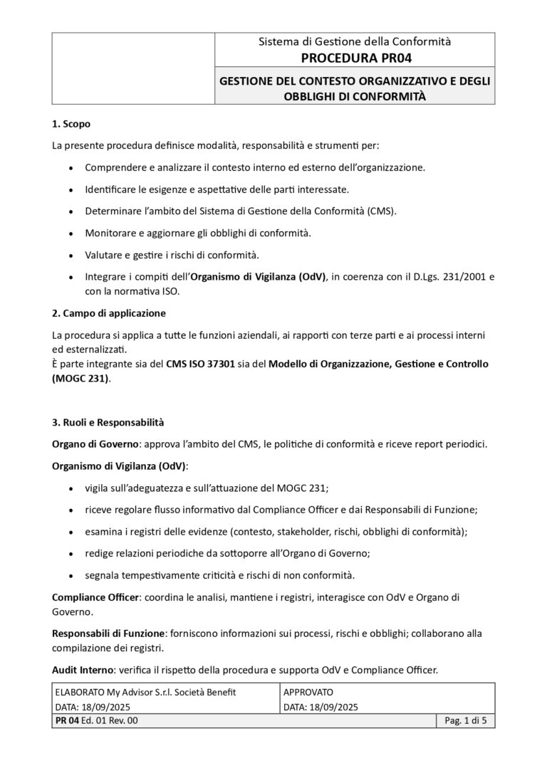 | 1 | PROCEDURA | PR04 | GESTIONE DEL CONTESTO ORGANIZZATIVO E DEGLI OBBLIGHI DI CONFORMITÀ | |